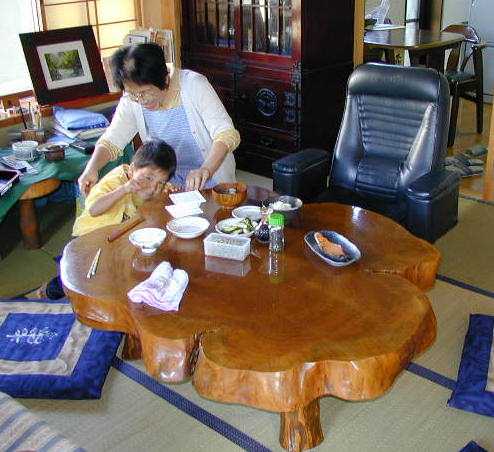 Kaori says her father is retired from insurance business and mostly gardens now while her mother still helps teach nursing. They live in a small house next to the large house they raised their 5 children in. So Kaori and her children come to visit and can stay in the larger house me, too which is usually empty I have the dreaded difficulty of sitting on the floor (fantastic tatami mats in most rooms), but I managed to get down and up without making a complete spectacle of myself. Kaoris mother fixed us an excellent dinner of tempura fried vegetables and squid and pork. It was very good but Im not very good with chopsticks Kaoris five-year-old outdoes me easily. The big table in their dining room is the cross-cut of a giant tree fantastic!