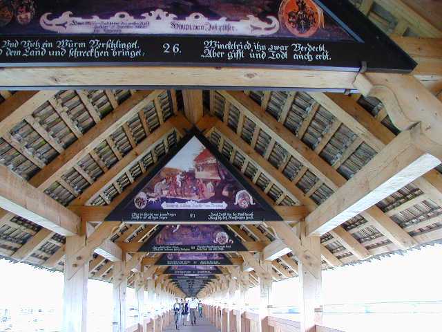 The next two nights were spent on beautiful Lake Lucerne with the Alps all around. Its a smaller city with a lot of history. They have a long, covered wooden bridge to walk along from one side of the lake to the other with triangular paintings on each beam of some of their historical highpoints. Its fascinating. Lucerne is also famous for the "Lion Memorial" which was carved into the granite cliff to commemorate the only Swiss soldiers who died in battle. They were protecting Louis XVII when the French revolution overwhelmed them all.