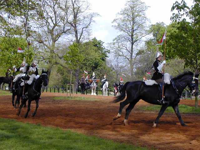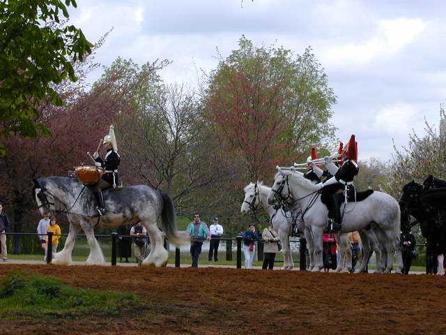 The next day we walked across Hyde Park to get to Harrods our hotel was at Marble Arch on one corner of the park. On the way we noticed some horses, buglers, and drums doing strange things over at a large open area. Naturally we had to go look. Turned out it was the "Queens Guard" (not to be confused with Buckingham Palace guards) who were practicing maneuvers for the queens birthday celebration coming up this summer. They were really impressive with their black horses, shiny breastplates and tasseled helmets. The huge Percheron (with fluffy feet) had two big kettledrums his rider hit; the reins were connected to the riders boots!