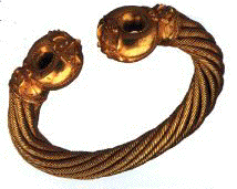 The Great Torc, from Snettisham, Norfolk, 1st Century BC. A characteristic Celtic ornament, the Torc is a heavy neck-ring made of twisted metal. This fine example is made of eight gold strands twisted together, each strand comprising eight gold wires. The ends are secured in elaborately decorated cast gold terminals. (From the British Museum Collection)